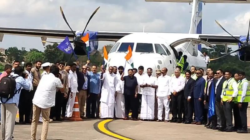 அதன்படி இன்று காலை 11.10 மணிக்கு பெங்களூரில் இருந்து 78 இருக்கைகள் கொண்ட இண்டிகோ சிறிய ரக விமானம் 74 பயணிகளுடன் புறப்பட்டு மதியம் 12.25 மணிக்கு லாஸ்பேட்டை விமான நிலையத்துக்கு வந்தடைந்தது. விமானம் தரையிறங்கிய போது, தண்ணீரை பீய்ச்சி அடித்து வரவேற்பு அளிக்கப்பட்டது. பின்னர், விமானத்தில் வந்த பயணிகளுக்கு பூ மற்றும் இனிப்பு வழங்கப்பட்டது.