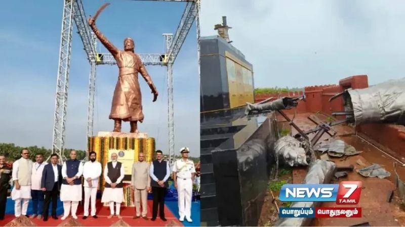 மகாராஷ்டிரா சிந்துதுர்க் மாவட்டம் மால்வானில் உள்ள ராஜ்கோட் கோட்டையில் மராத்திய மன்னர் சத்ரபதி சிவாஜியின் சிலையை கடந்த ஆண்டு டிசம்பர் 4-ம் தேதி கடற்படை தினத்தையொட்டி பிரதமர் நரேந்திர மோடி சிலையை திறந்து வைத்தார். இந்த 35 அடி உயரமுள்ள சிவாஜி சிலை நேற்று (ஆக. 26) இடிந்து விழுந்தது. கடந்த 3 நாள்களாக அப்பகுதியில் பலத்த காற்றுடன் கனமழை பெய்த நிலையில், சிலை உடைந்ததற்கான காரணத்தை அதிகாரிகள் ஆய்வு செய்து வருகின்றனர்.