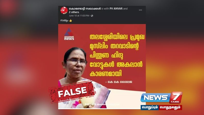 தேர்தல் தோல்வி குறித்து பதிலளித்த இடது ஜனநாயக முன்னணி வேட்பாளர் கே.கே.ஷைலஜா, தோல்விக்கு இந்துக்கள் வாக்குகள் குறைந்ததே காரணம் என்றும், தளச்சேரியில் உள்ள முக்கிய முஸ்லிம் குடும்பத்தின் ஆதரவால் இந்துக்கள் வாக்குகள் தனக்கு கிடைக்காமல் போனதாகவும் கே.கே.ஷைலஜாவின் படத்துடன் ஏசியாநெட் நியூஸ் வெளியிட்ட நியூஸ் கார்டு ஒன்று சமூக வலைதளங்களில் வெளியானது.