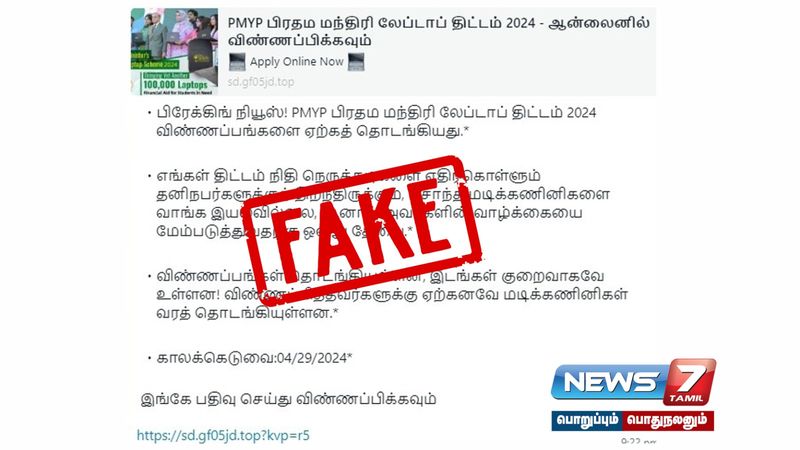 மத்திய அரசு சார்பில் லேப்டாப் வழங்கப்படுவதாக செய்திகள் இணையத்தில் வைரலாகி வருகிறது. அதில், ”பிரேக்கிங் நியூஸ்! PMYP பிரதம மந்திரி லேப்டாப் திட்டம் 2024 விண்ணப்பங்களை ஏற்கத் தொடங்கியது. எங்கள் திட்டம் நிதி நெருக்கடிகளை எதிர்கொள்ளும் தனிநபர்களுக்கு பயனளிக்கும், சொந்த மடிக்கணினிகளை வாங்க இயலவில்லை, ஆனால் அவர்களின் வாழ்க்கையை மேம்படுத்துவதற்கு ஒன்று தேவை என்று கருதுபவர்களுக்கு இந்த திட்டம் உகந்ததாக இருக்கும். அதற்காக விண்ணப்பிக்க அவகாசம் தொடங்கியுள்ளது. குறைந்த அளவிலான லேப்டாப்களே கையிருப்பில் உள்ளன" என்ற தகவலுடன் பிரதம மந்திரியின் இலவச லேப்டாப் திட்டம் துவங்கப்பட்டுள்ளதாகவும், அதற்கு விண்ணப்பிக்க ஏப்ரல் 30ஆம் தேதி கடைசி நாள் என்றும் கூறி சமூக வலைதளங்களில் தகவல் ஒன்று https://giftst.vje6zf.top?lma=n87 என்ற லிங்குடன் இணையத்தில் வேகமாக பரவி வருகிறது.