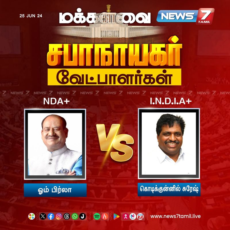 மக்களவை சபாநாயகர் தேர்தலில் போட்டியிட, என்டிஏ கூட்டணி சார்பில் ஓம் பிர்லா மற்றும் இந்தியா கூட்டணி சார்பில் கொடிக்குன்னில் சுரேஷ் வேட்புமனு தாக்கல் செய்துள்ளனர்.