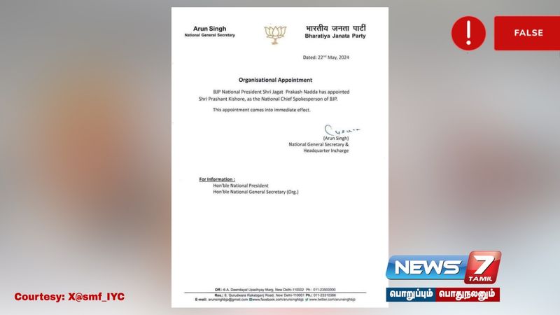 பாஜகவின் தேசியத் தலைமை செய்தி தொடர்பாளராக பிரசாந்த் கிஷோர் நியமிக்கப்பட்டுள்ளதாக கூறி அறிக்கை ஒன்று சமூக வலைத்தளங்களில் பரவி வருகின்றது.