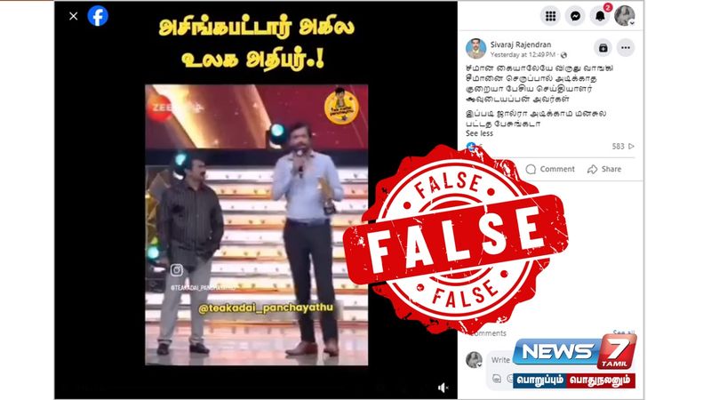 சீமான் கையாலேயே விருது வாங்கி, அவரையே அவமரியாதையாக பேசிய தனியார் தொலைக்காட்சி நெறியாளர் ஆவுடையப்பன் என்று ஒரு வீடியோ சமூக ஊடகங்களில் பகிரப்பட்டு வருகிறது. இது தொடர்பான உண்மைத் தன்மை குறித்து FactCrescendo ஆய்வு செய்தது. இது குறித்து விரிவாக காணலாம்.