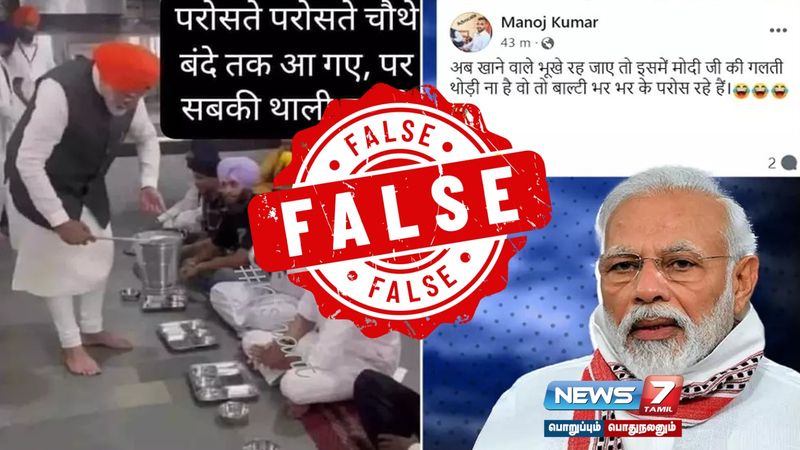 இந்நிலையில், பிரதமர் மோடி உணவு பரிமாறும் புகைப்படம் ஃபேஸ்புக் மற்றும் ட்விட்டரில் தவறான கூற்றுடன் பரவலாக பகிரப்பட்டு வருகிறது. இந்தப் படத்தை ஃபேஸ்புக்கில் பகிரும் போது, ஒரு பயனர் இவ்வாறு பதிவிட்டிருந்தார், 'இது கடந்த பத்து ஆண்டுகளாக நடக்கிறது. வெற்றுக் கரண்டியை காலி வாளியில் நனைத்து, காலி தட்டில் பரிமாறும் போட்டோஜெனிக் வித்தை!'
